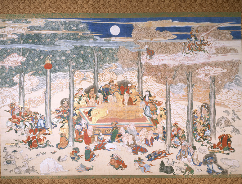釈迦が亡くなる際に僧侶や武将など、人間から動物までこの世の生き物や鬼神らが釈迦を囲んで悲しんでいる様子が描かれています。古代インドの町クシナーラのサーラ樹の木陰で頭を涼しい北に向け、右向きに横たわった釈迦は、「この世はすべて無常である。そなたたちは怠ることなく努力するように…」と弟子のアーナンダたちに最後の説法をし、静かに禅定に入られました。 嗚咽の声や忍び泣きが聞こえそうなこの絵は、江戸時代の絵師が書いたと思われますが、正確な年代などは分かっていません。横250cm、縦200cmほどで、涅槃図としてはかなり大型の部類に入ります。