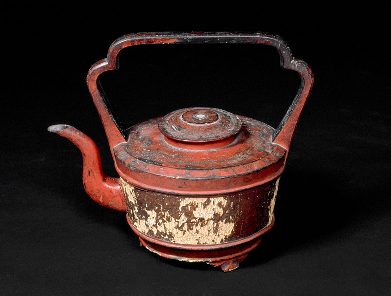 水瓶は飲料水などを入れておくのに用いられたものです。桐材らしき木製のこの大振りな水瓶は、取っ手までの高さ34cm、本体の直径25cmで根来塗りが施されています。