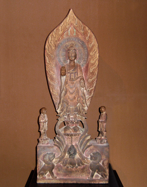 二重火炎の舟形光背を背にし、両脇には比丘像を配して、施無畏・与願印を結んだ釈迦如来立像である。