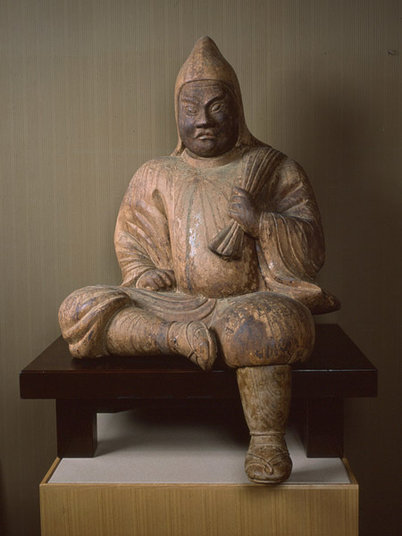 にこやかに米俵の上に立つ大黒さまの姿はなじみ深いですが、そのルーツであるインドの大黒天は三面六臂の姿です。これが僧侶たちに食料をもたらす神となり、日本には平安時代に伝えられたそうです。さらに大国主神が「だいこく」とも読めることから同じ神と考えられるようになり、福の神として庶民の信仰を集めました。古い大黒天は、鎧を着て片足を垂らして台座に腰を下ろしている武装した半跏像と、左肩に袋を背負い、右手に小槌を持つか、拳印を結んだ平服姿の立像に大別されます。 像高120cmのこの像は鎌倉時代の作とされ、半跏像でありながら武装像ではないところが特徴的です。厳しい表情や、睨むような目に大黒天本来の戦闘神としての面影を残しています。